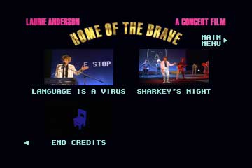 The next step was to create some menus for Adobe Encore DVD. To get the fonts that Laurie used in the slides during her show (Chicago, Monaco, Geneva), I fired up an old Macintosh running System 7. I wanted the old-school blocky bitmapped fonts, so I had to make some system tweaks to disable TrueType fonts. Once I figured out the tricks in using layers in Adobe Photoshop to highlight selections on the DVD menus, I was able to create the following DVD menus using scans from the Laserdisc cover art and frame captures from the video.